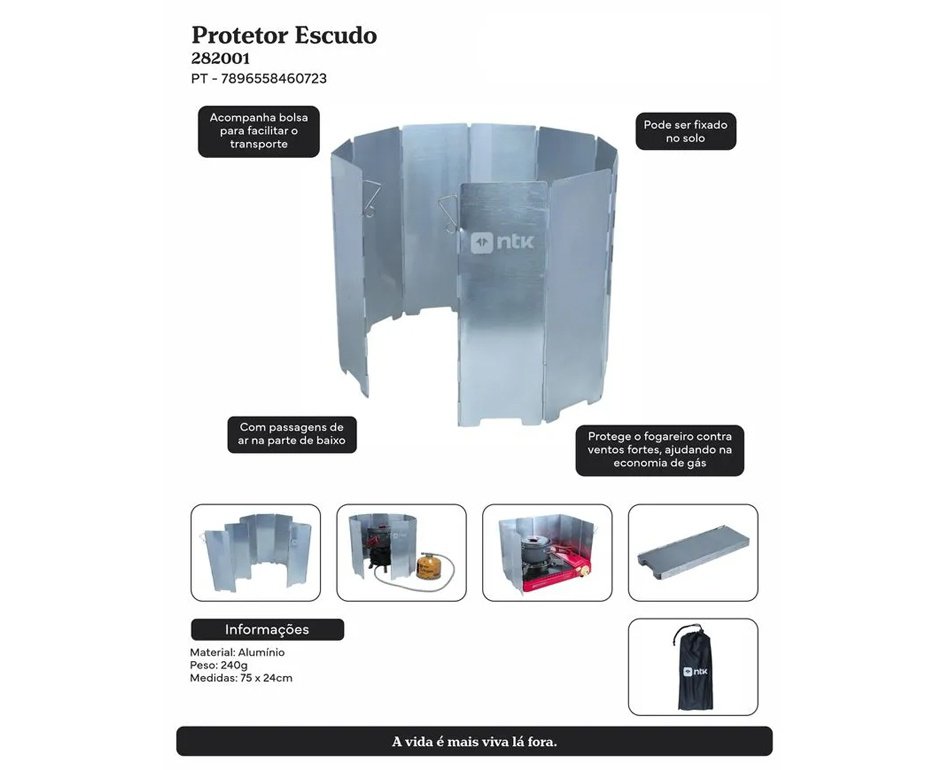 Com design sanfonado e estrutura em alumínio leve e resistente, o escudo forma uma barreira protetora que evita que o vento apague ou desestabilize a chama do fogareiro. Isso significa menos desperdício de gás e muito mais segurança e agilidade na hora de cozinhar.